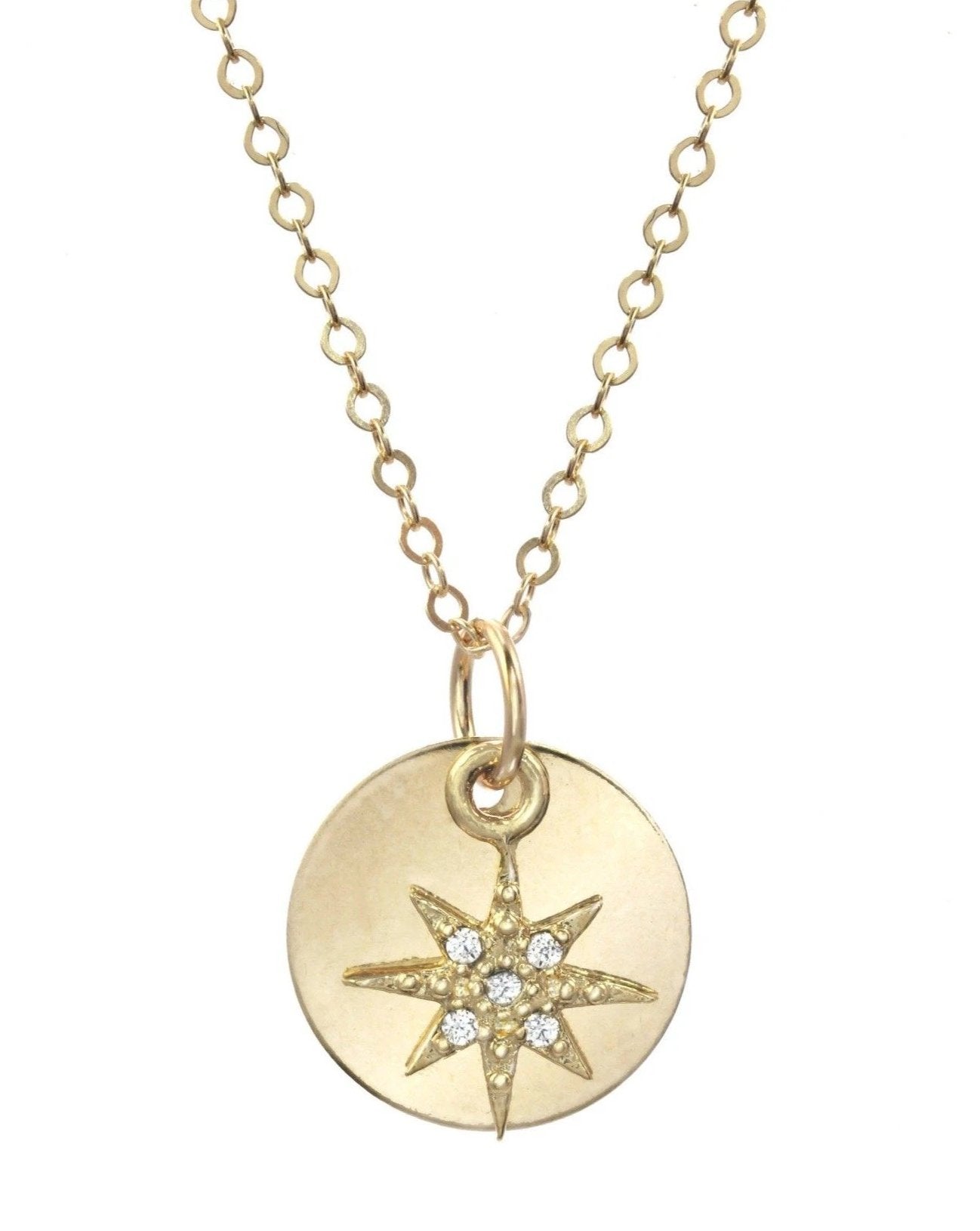 Chloe Necklace by KOZAKH. A 16 inch long Rollo chain necklace in 14K Gold Filled, featuring a 16mm Coin medallion.Chloe Necklace by KOZAKH. A 16 inch long Rollo chain necklace in 14K Gold Filled, featuring a 16mm Coin medallion.
