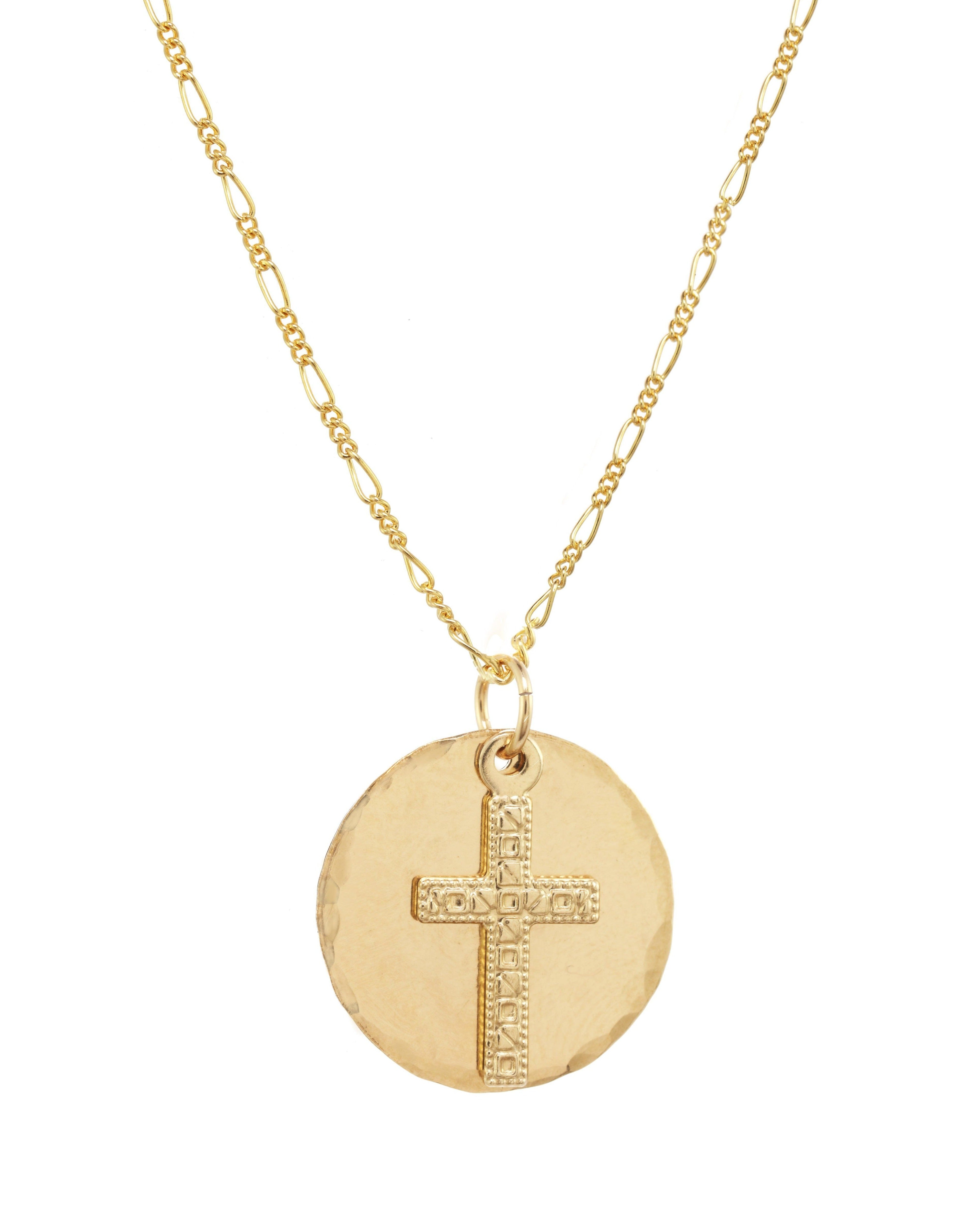 San Cris Necklace by KOZAKH. A 16 to 18 inch adjustable length necklace, crafted in 14K Gold Filled, featuring a 16mm Saint Christopher Medallion.San Cris Necklace by KOZAKH. A 16 to 18 inch adjustable length necklace, crafted in 14K Gold Filled, featuring a 16mm Saint Christopher Medallion.