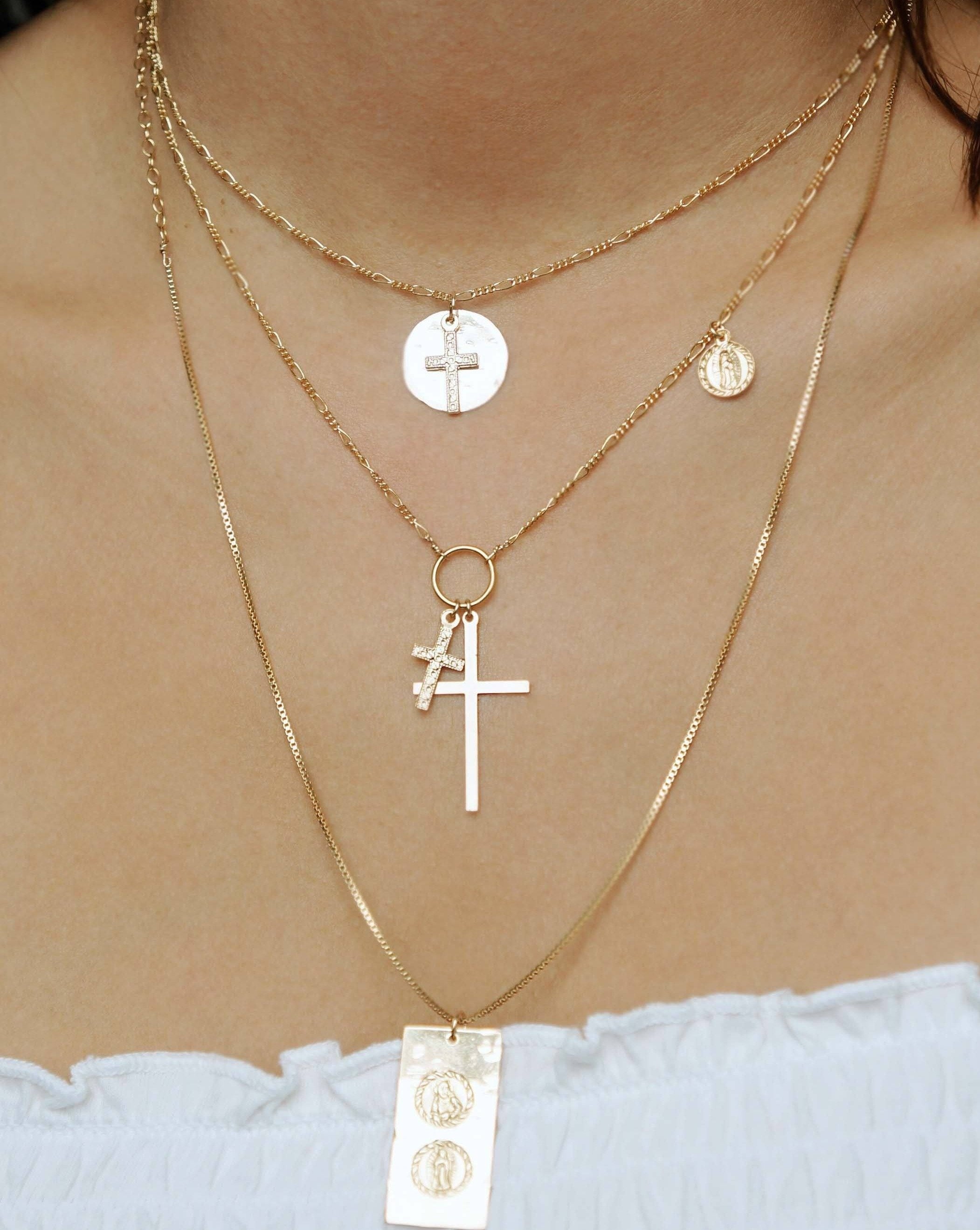 Domingo Necklace by KOZAKH. A 16 to 18 inch adjustable length necklace in 14K Gold Filled, featuring a Saint Christopher medallion, a 6mm Heart charm, and a Filigree decorated cross.Domingo Necklace